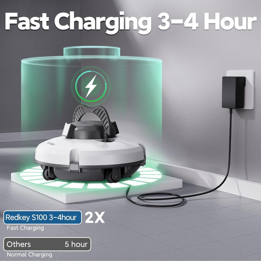 - Cordless Pool Vacuum: Compared with suction and pressure pool cleaners for inground pools, the Redkey robotic pool cleaner is cordless and hassle-free. Don’t worry about tangled wires and messy hoses. Just charge it, click the switch, drop the cordless pool vacuum into the water and it’s ready to go. Save your energy and improve pool cleaning efficiency