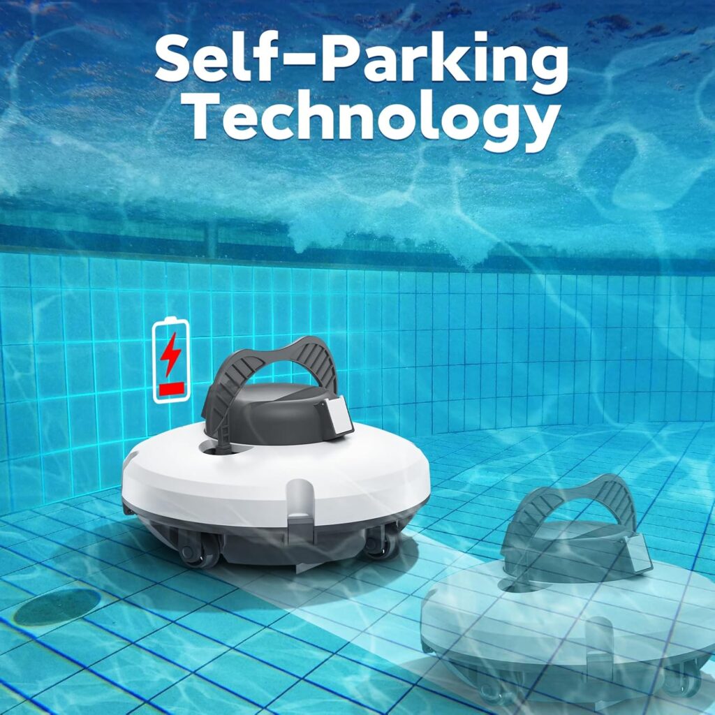 - 18°Climbing Ability & Self-Parking Tech: 18° obstacle-crossing capability prevents the pool vacuum from getting stuck in the folds of the pool. The Advanced water sensor tech allow the pool robot vacuum for quick reversal upon touching pool walls, reducing collision. When automatic pool vacuum is done cleaning or if the battery gets low, it automatically docks itself next to the pool wall, making it easy to retrieve with the retrieval hook.