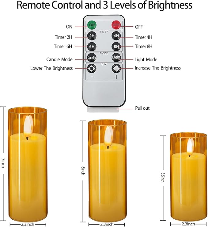 - Timer Function:remote control candles can be turned on/off by pressing the button at the bottom and controlled by 2 remote controls within 16.4 feet,The 10-key remote control provides a 2H/4H/6H/8H timer options, adjust the light modes and brightness
